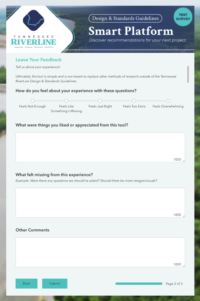 Filling out a simple survey will be the first step for people hoping to implement RiverLine guidelines. The answers will help the smart platform to guide project managers and owners to the appropriate Tennessee RiverLine Design & Standards Guidelines. We have created test surveys to get your feedback on the process.